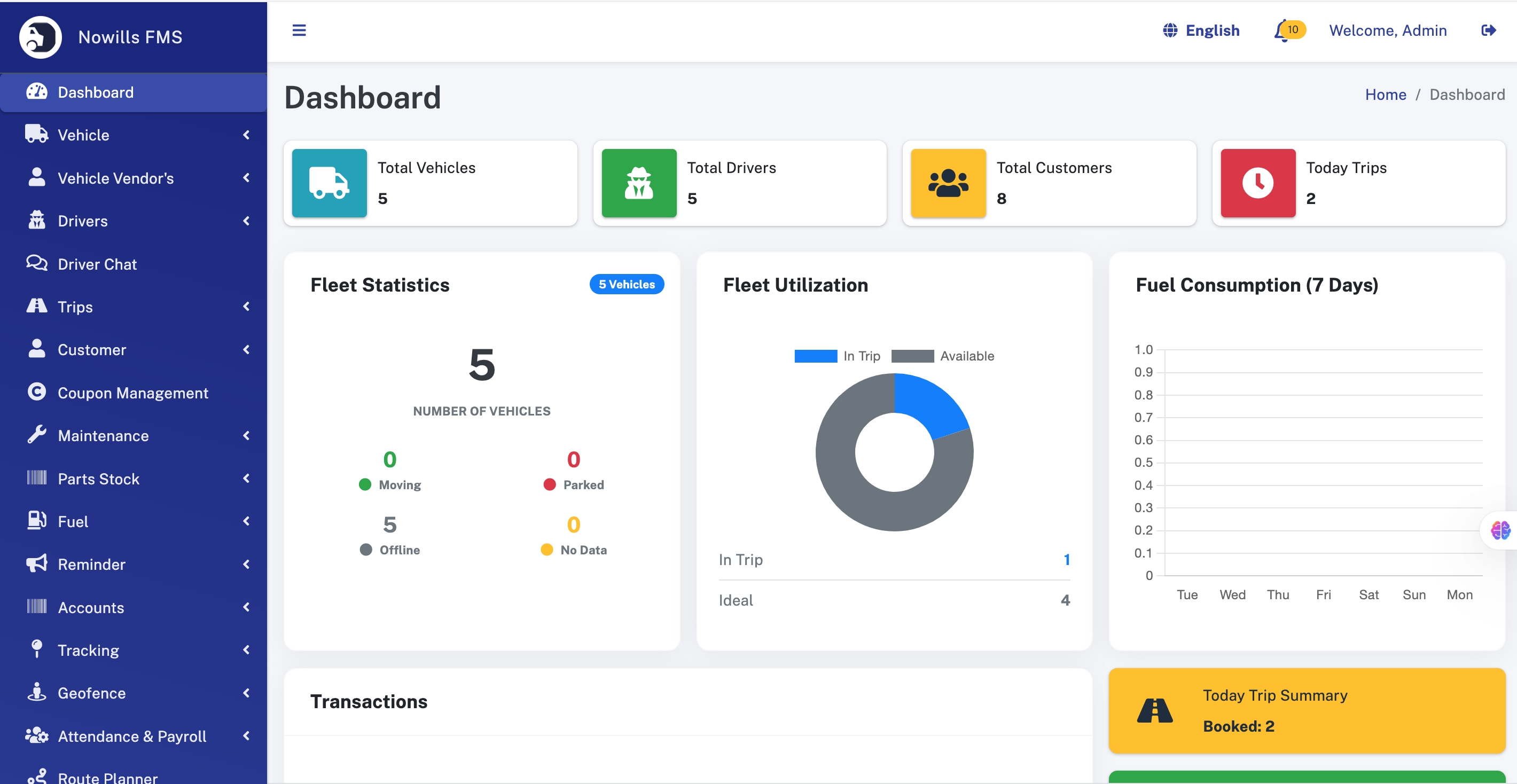 - Today's Activity: Summary of Today's Trips, Transactions (Income/Expense), and Active Vehicles.