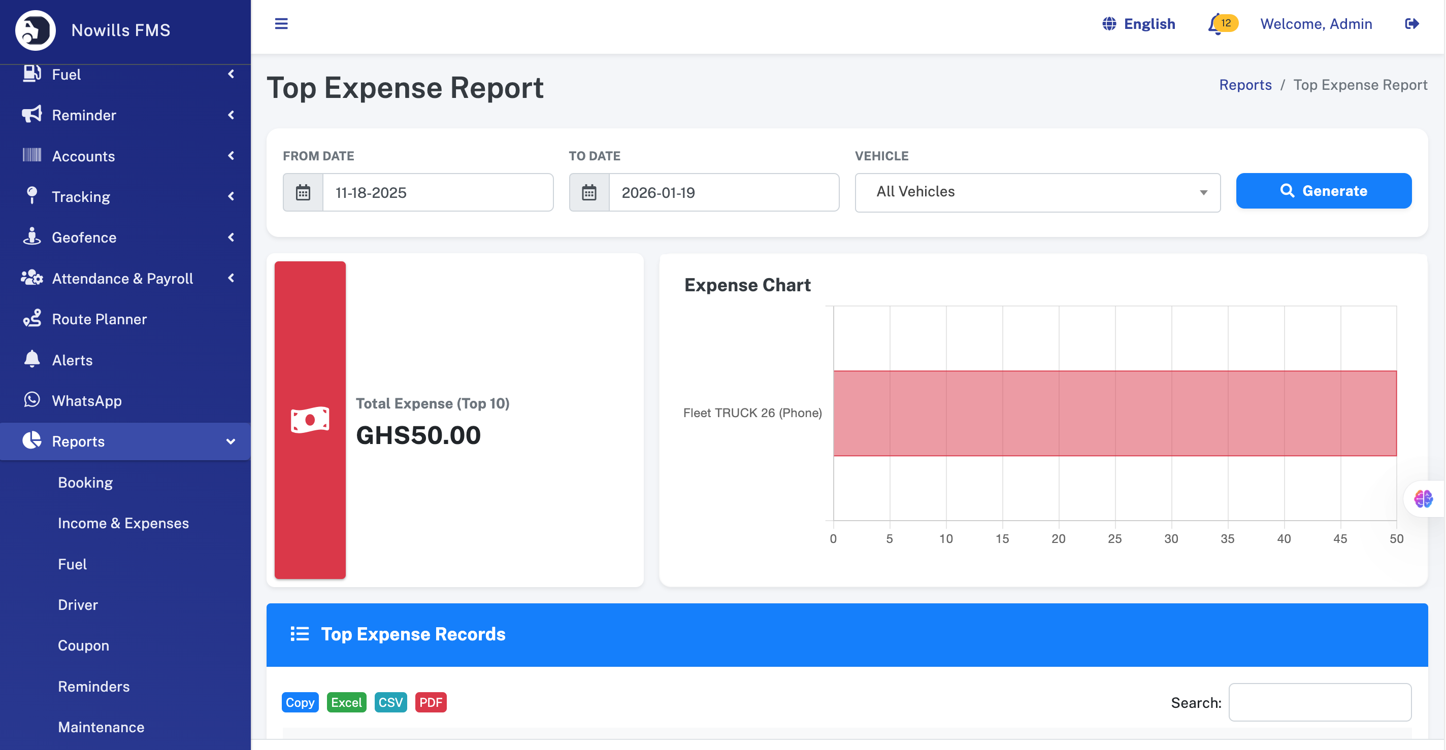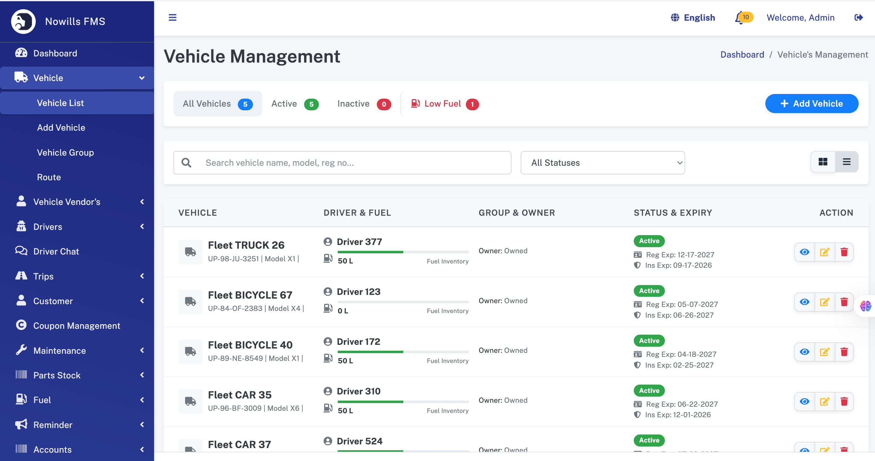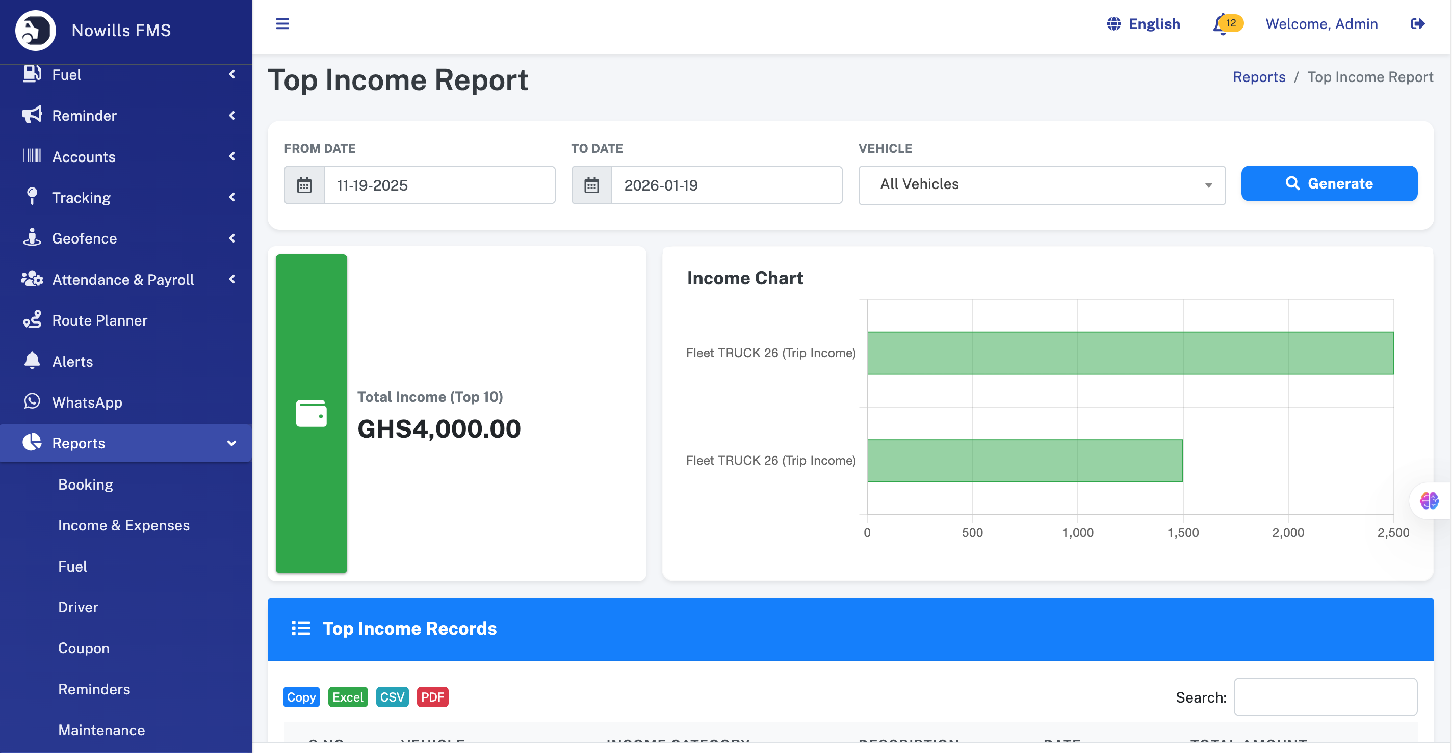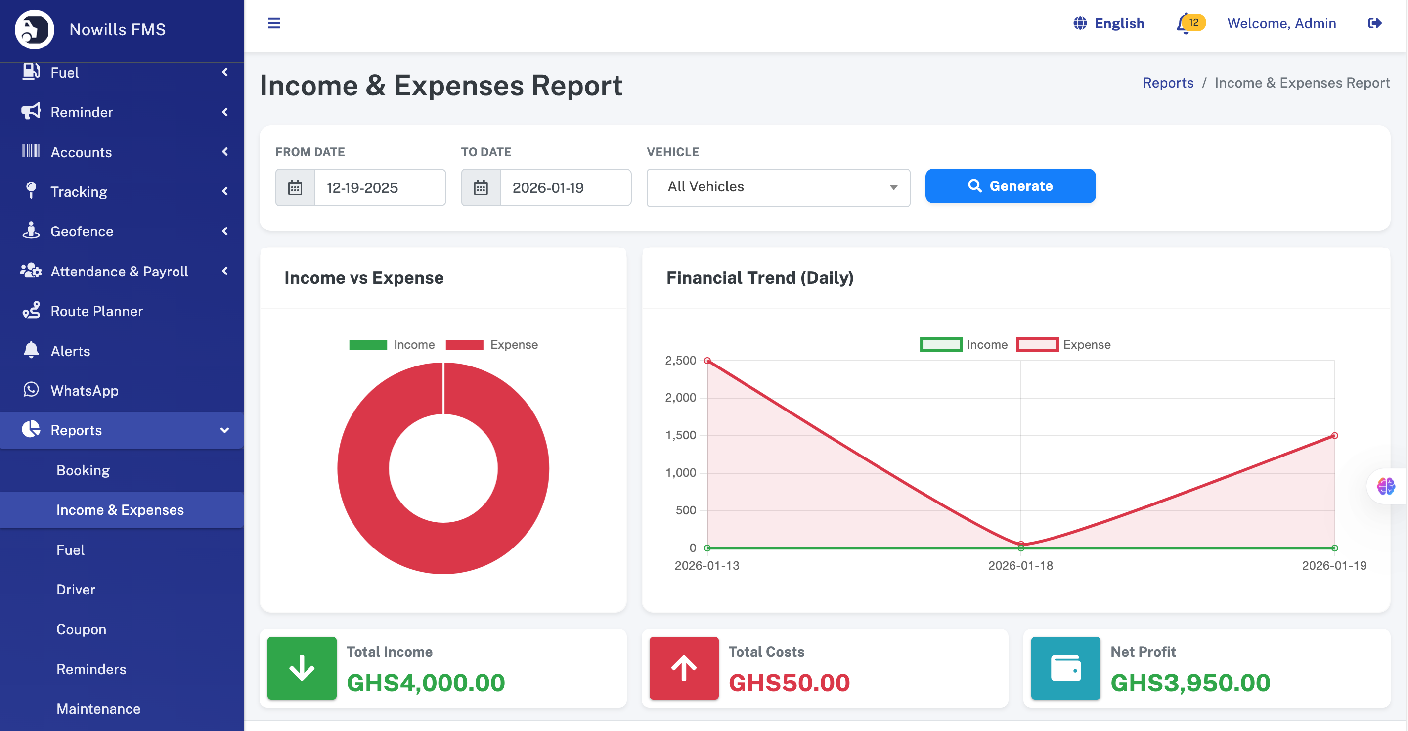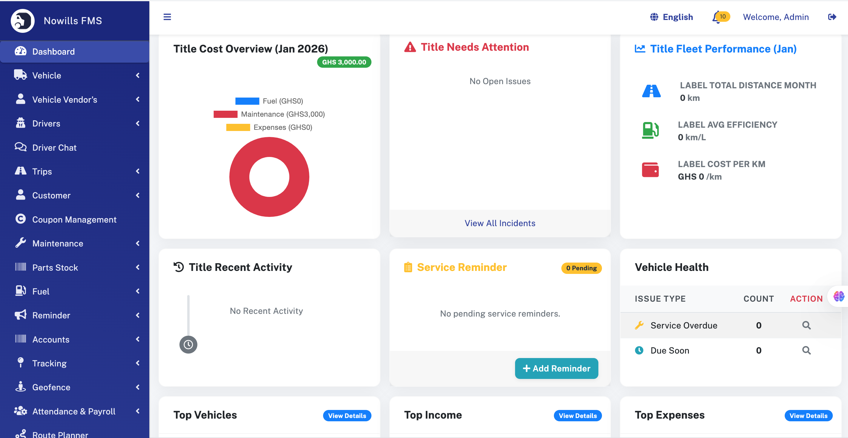 - Top Performers: Widgets displaying Top Income generating vehicles and Top Expense incurring vehicles.