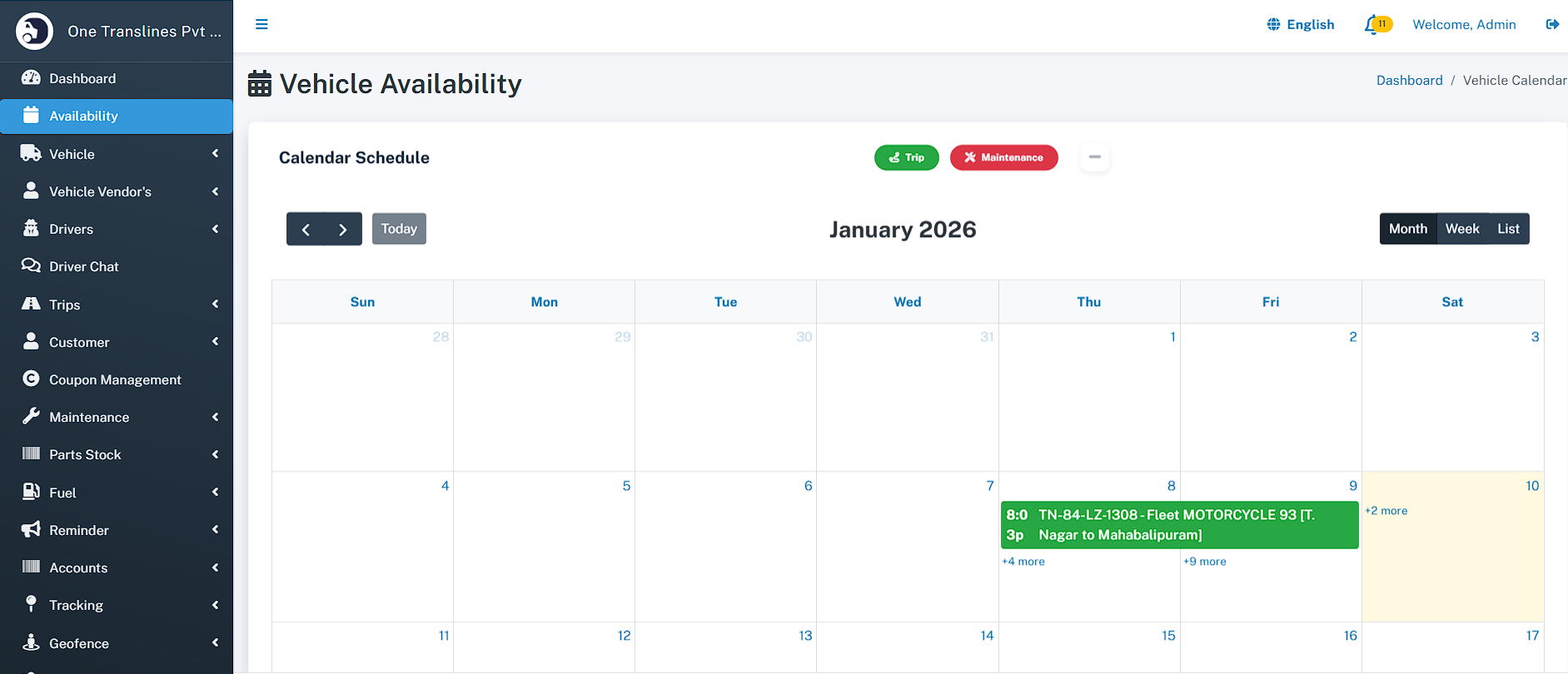 - Interactive Timeline: Users can switch between Month, Week, and Day views to plan schedules effectively. Clicking on an event redirects to the specific Trip Details or Maintenance record.