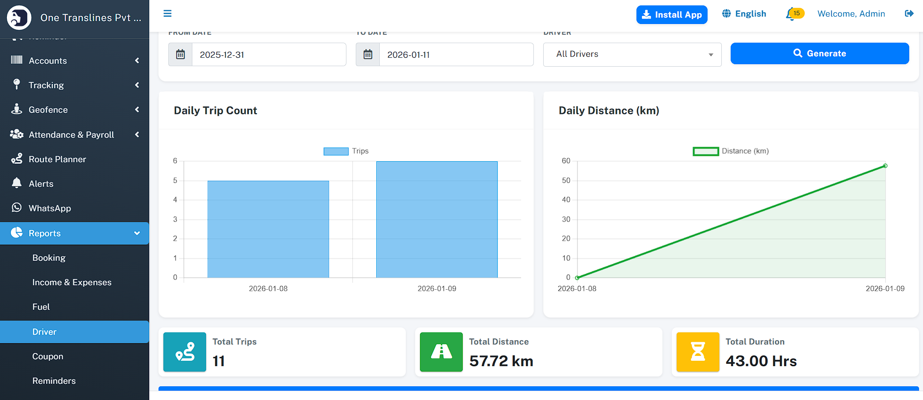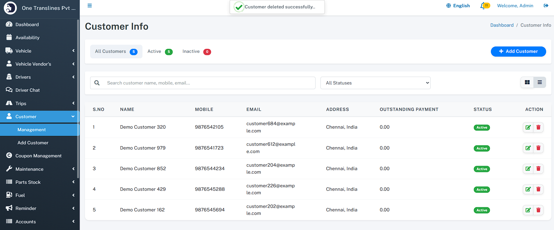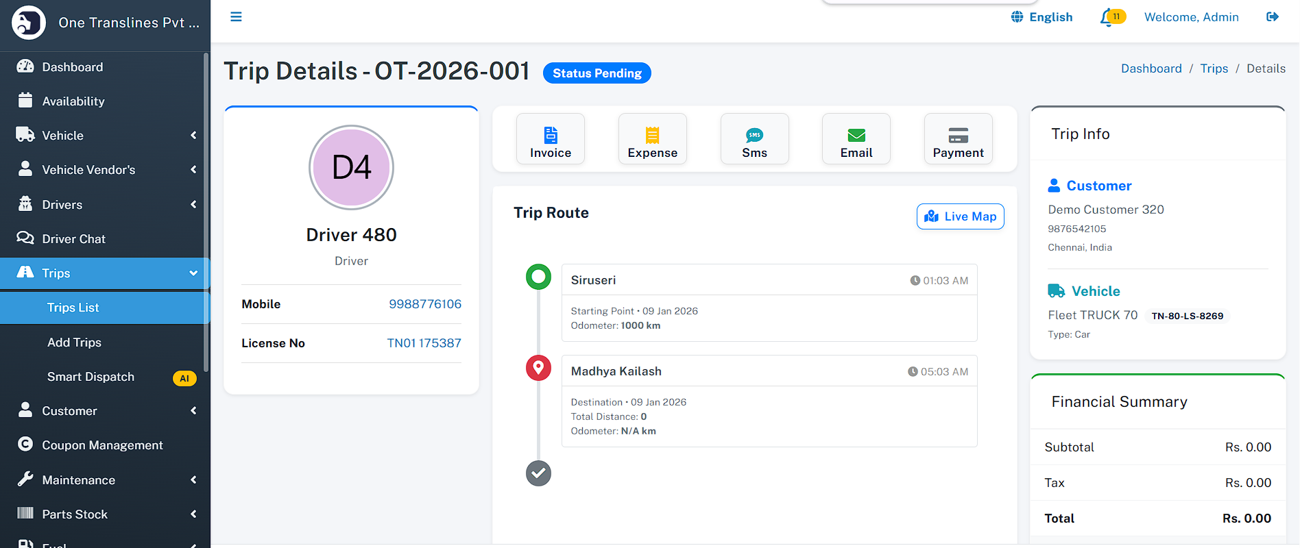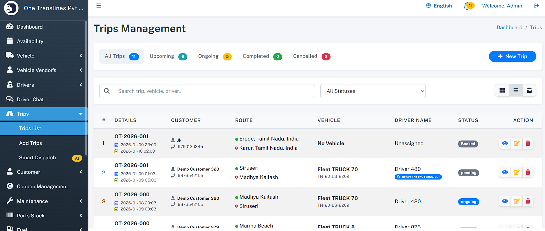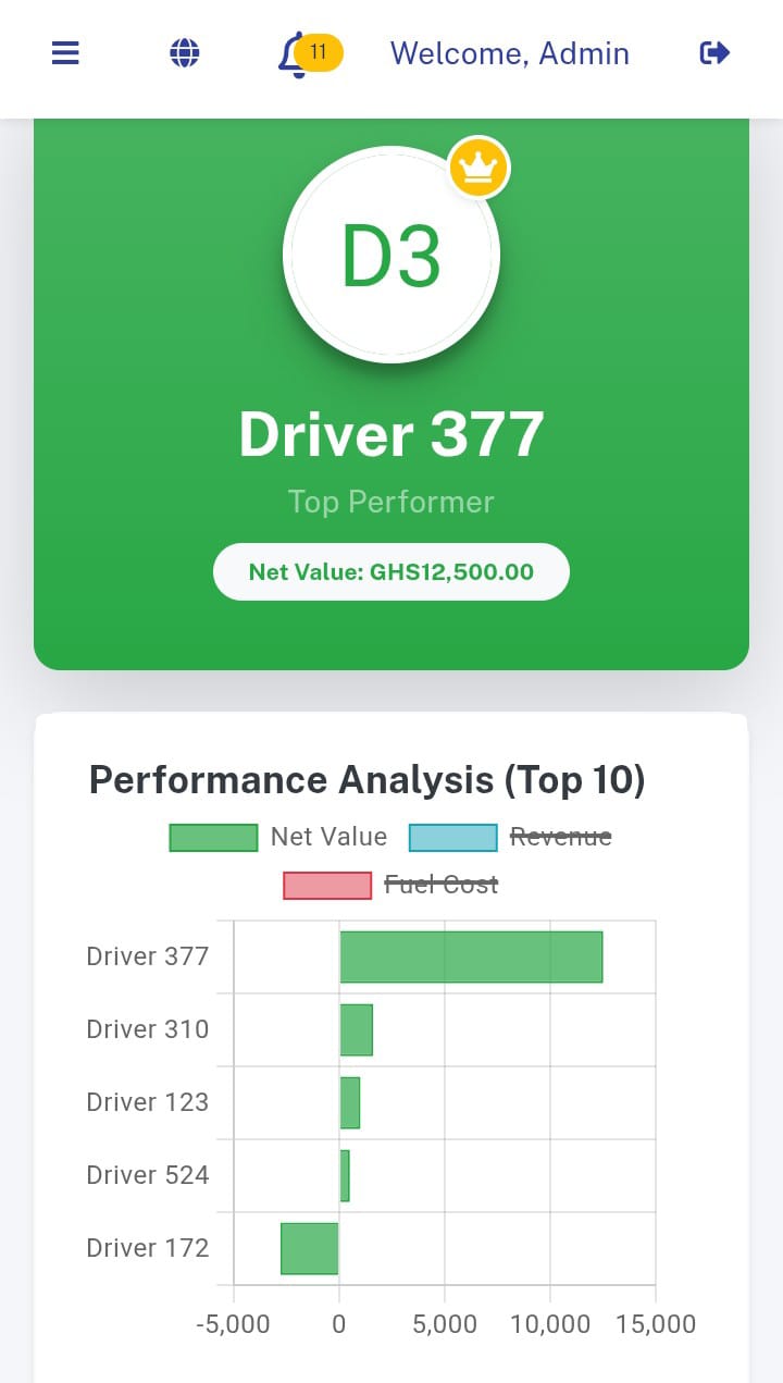 - Total Assets: Instant count of total Vehicles, Drivers, and Customers.
