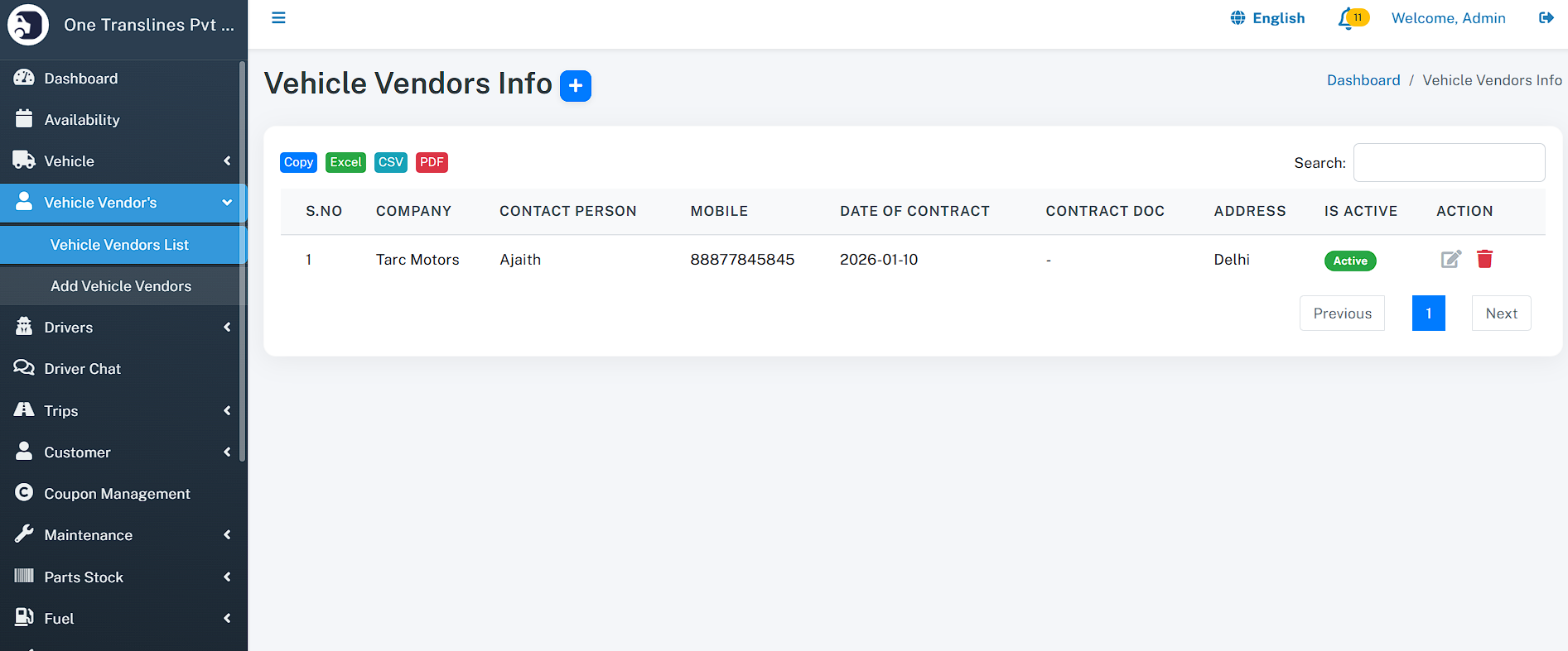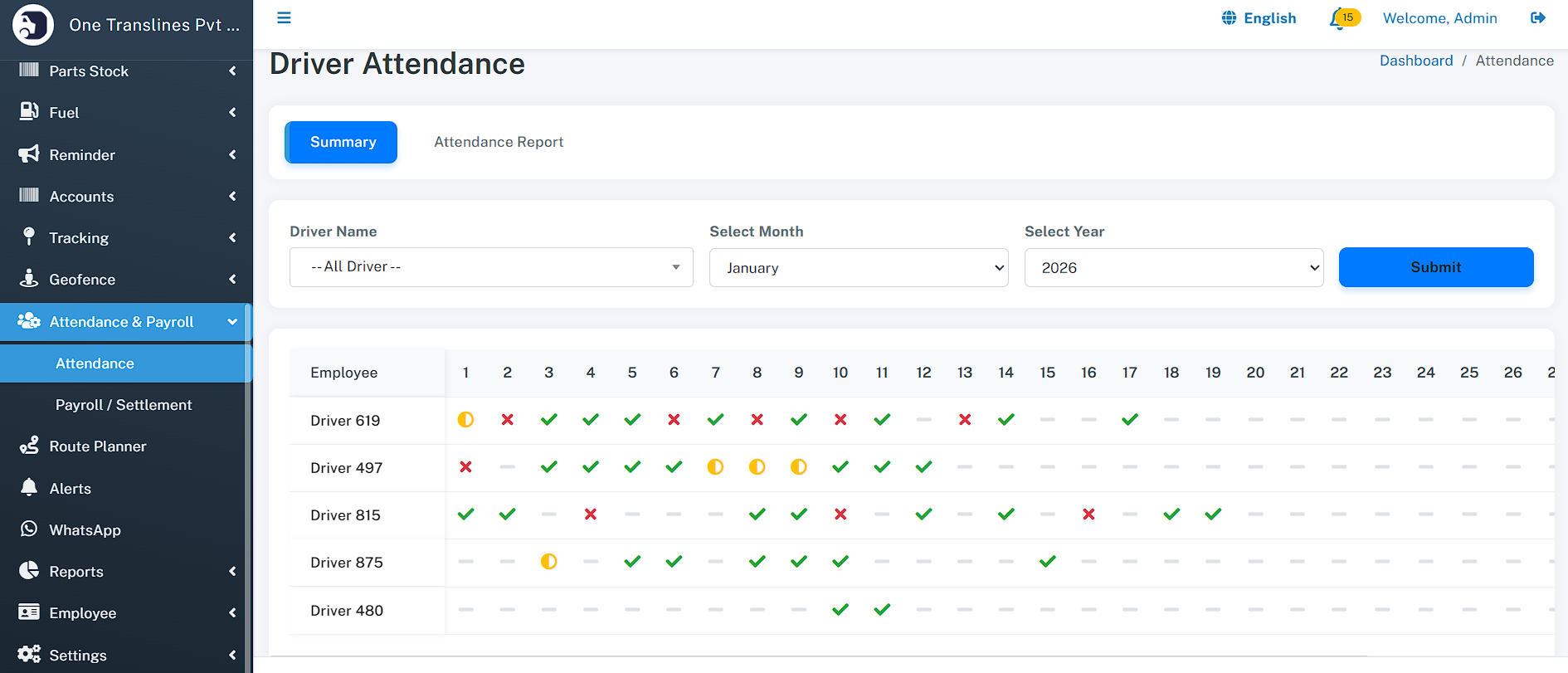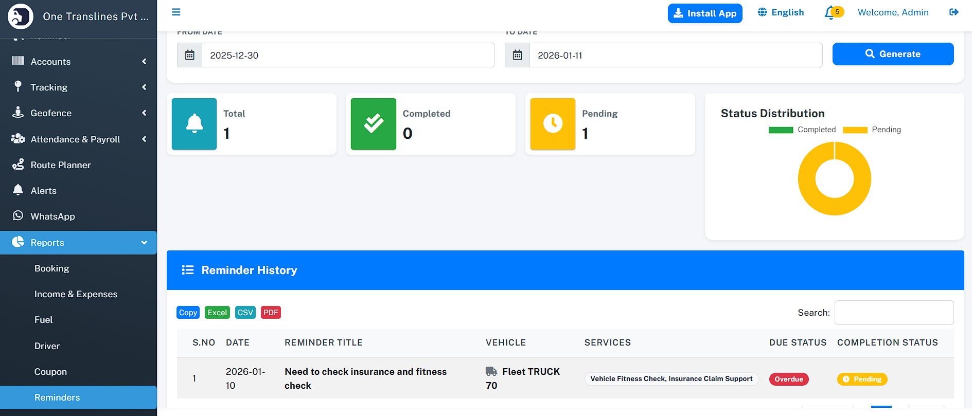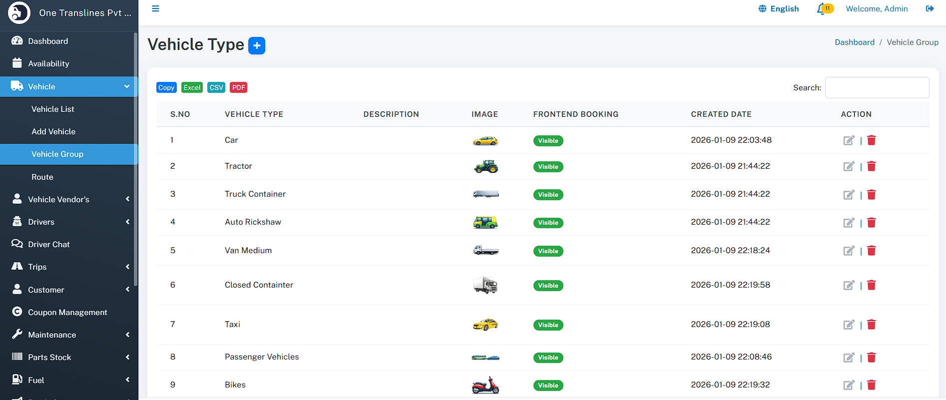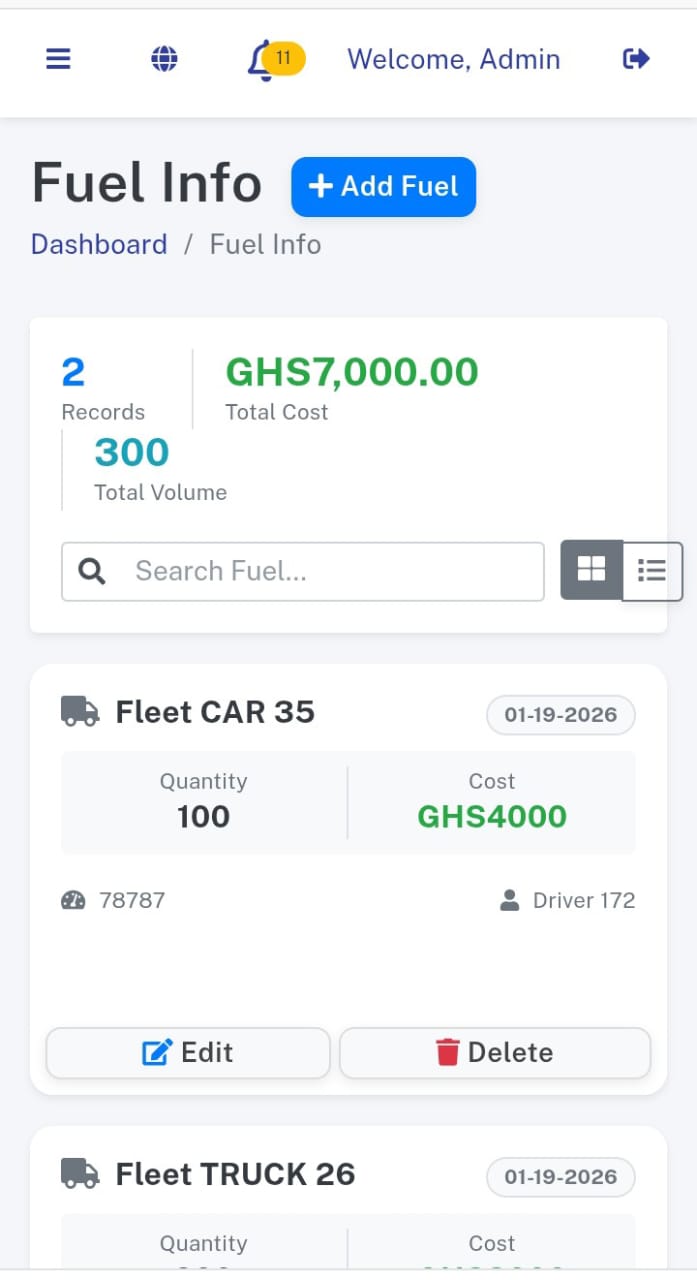 - Total Assets: Instant count of total Vehicles, Drivers, and Customers.