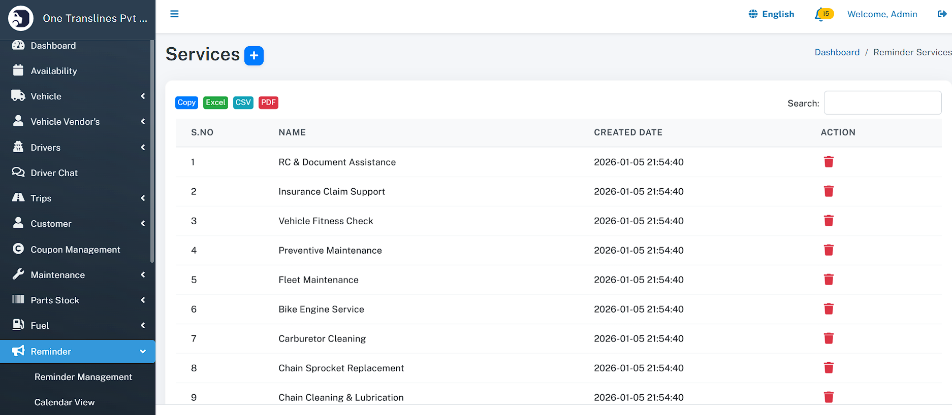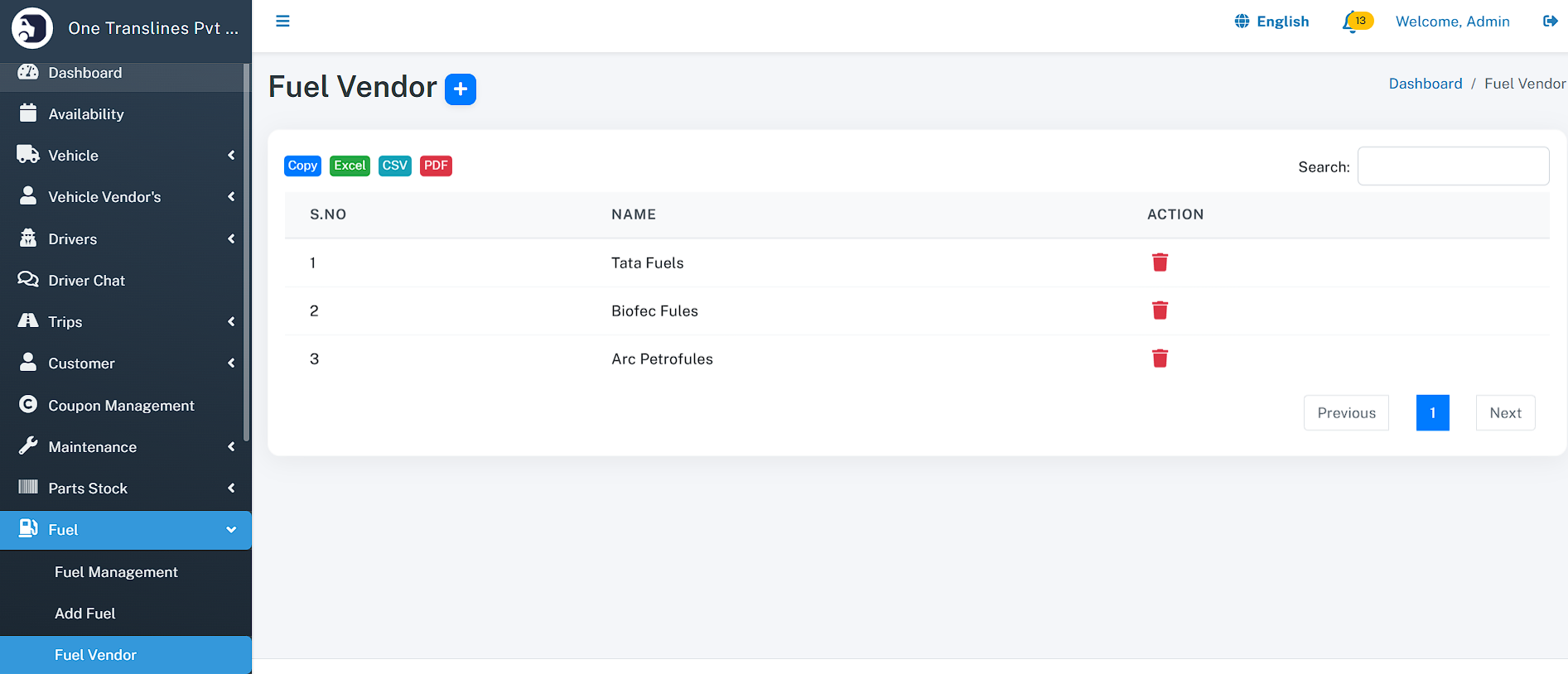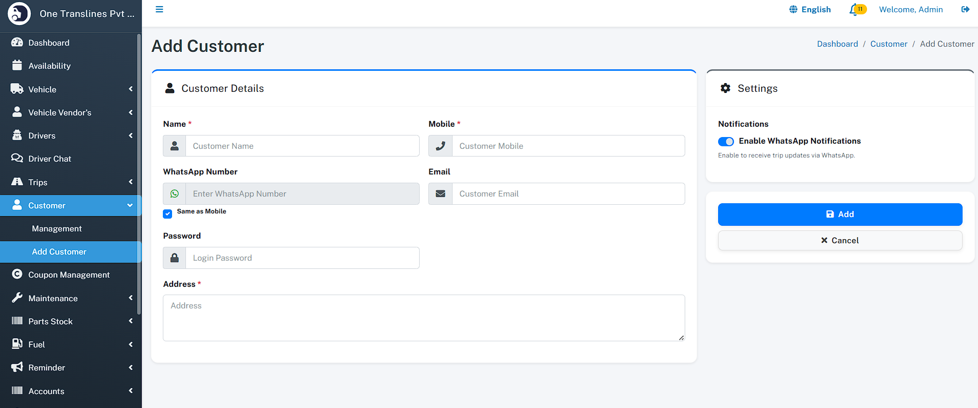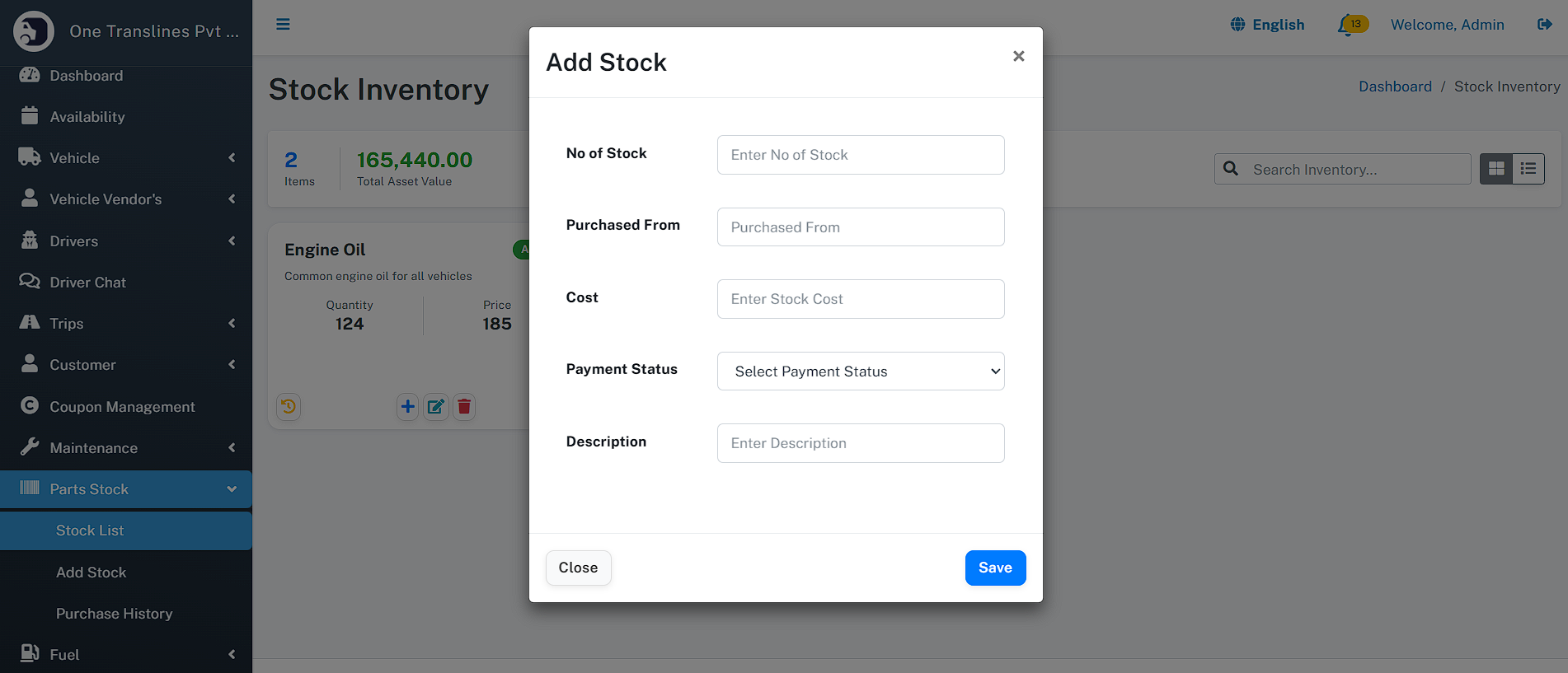 - Total Assets: Instant count of total Vehicles, Drivers, and Customers.