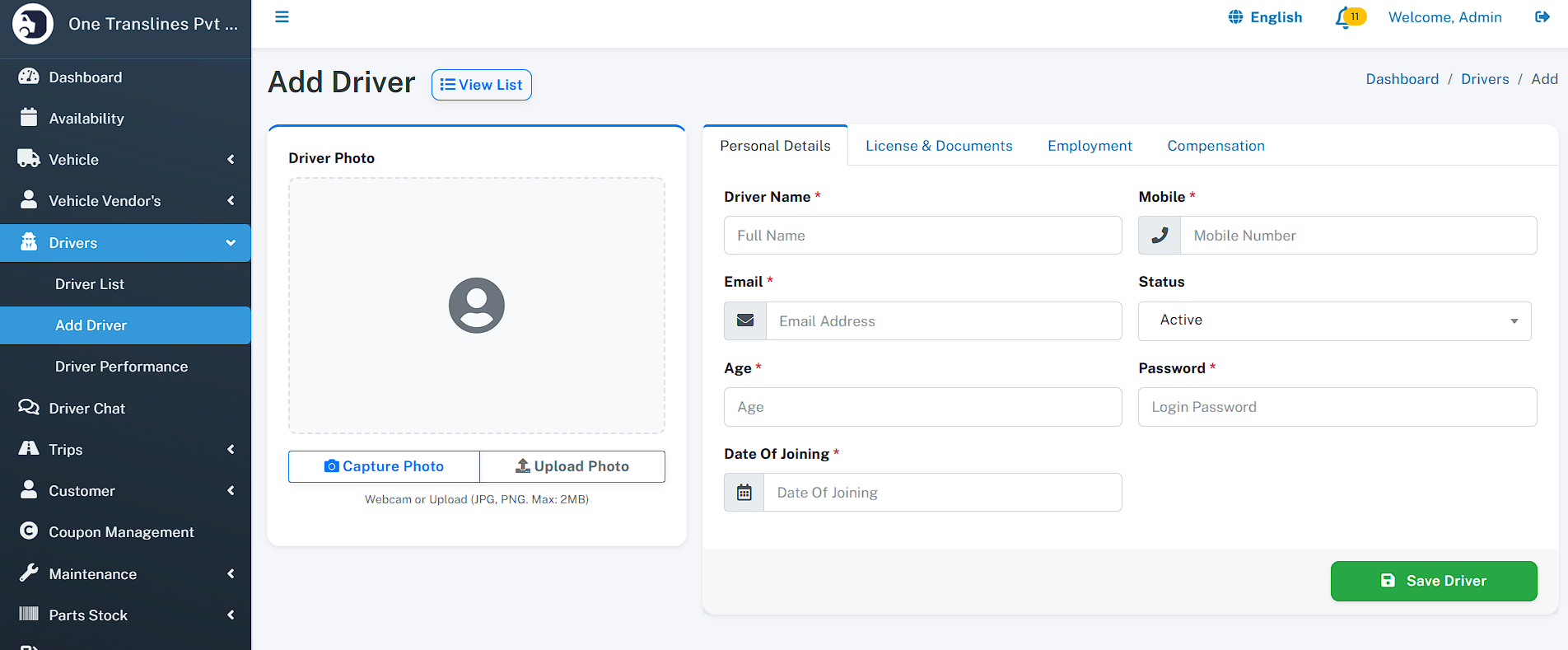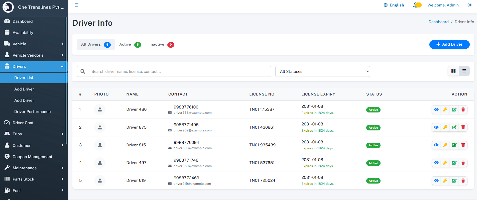 - Drivers - Driver List - Add Driver - Driver Performance