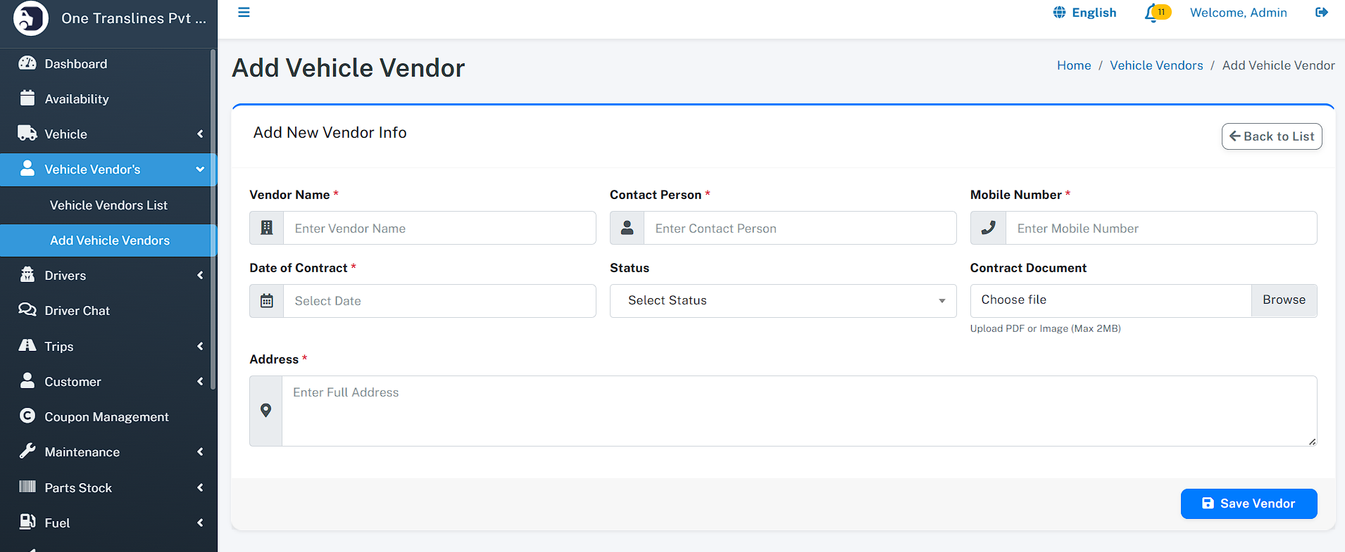 - Vehicle Vendors - Vendor List - Add Vendor
