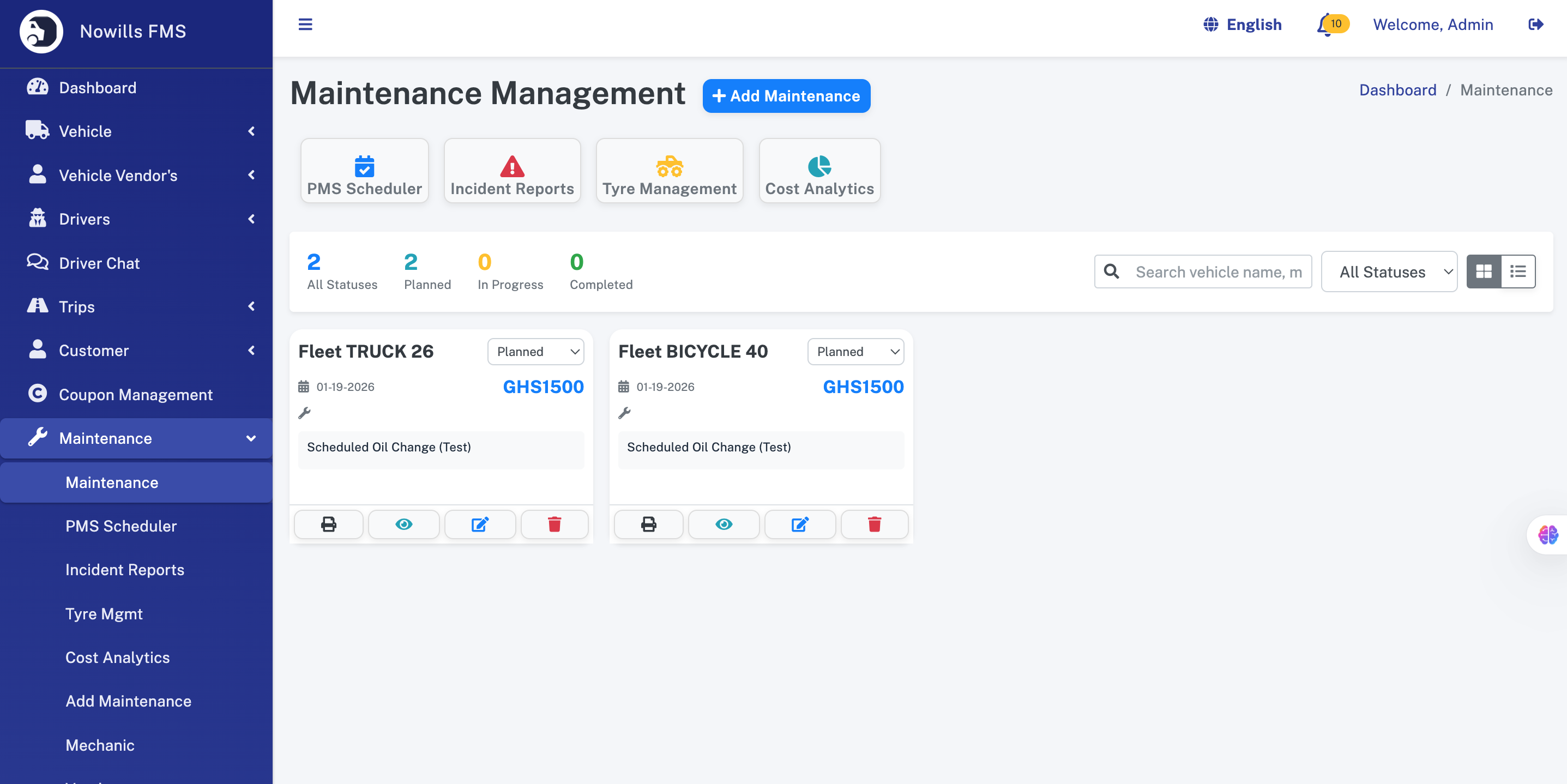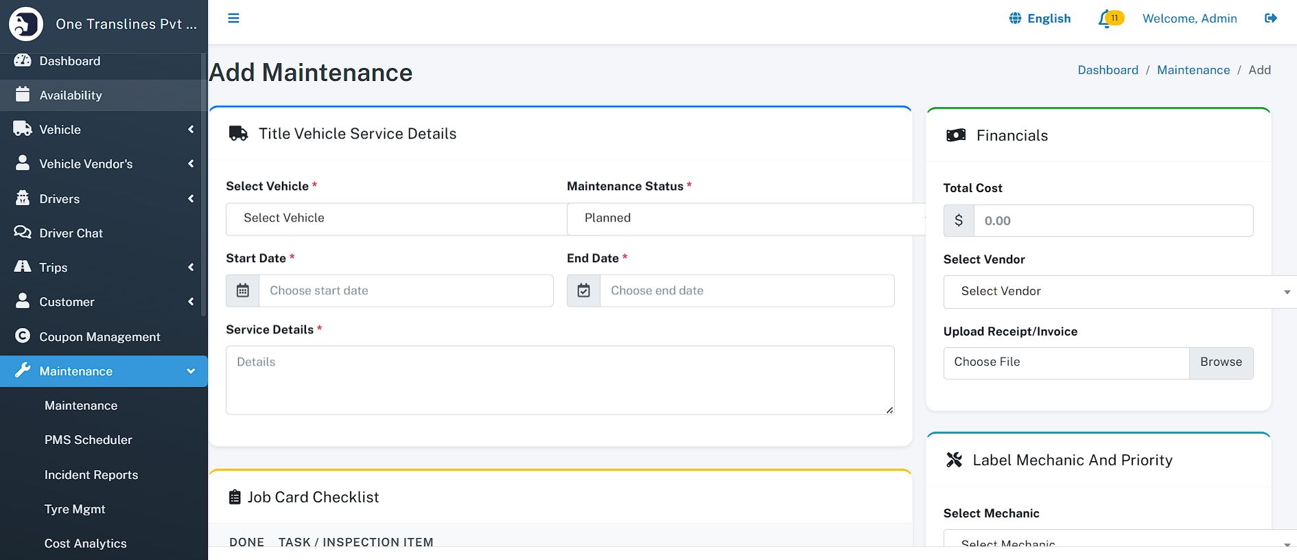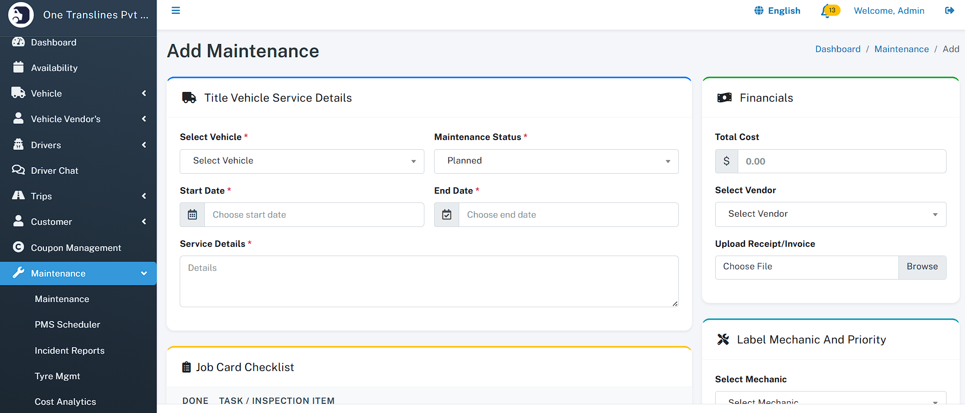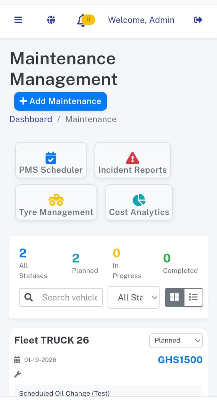 - Maintenance - Maintenance List - PMS Scheduler - Incident Reports - Tyre Management - Cost Analytics - Add Maintenance - Mechanic - Vendor