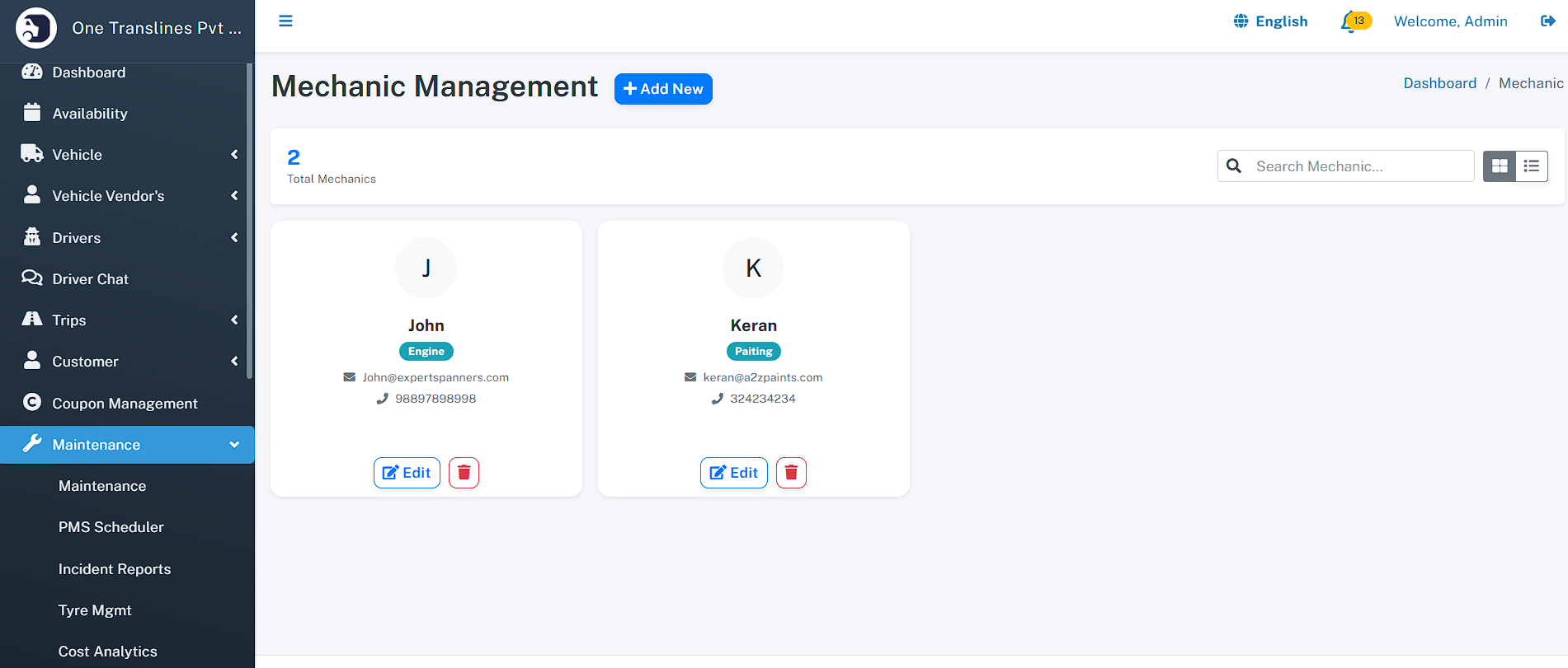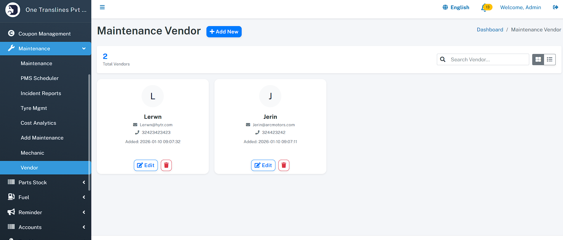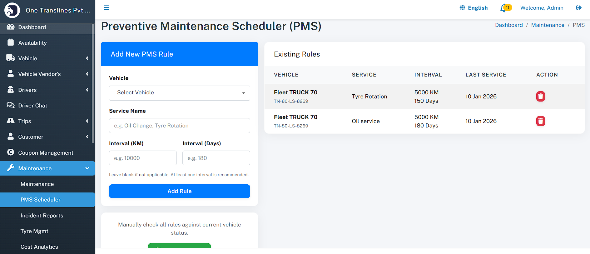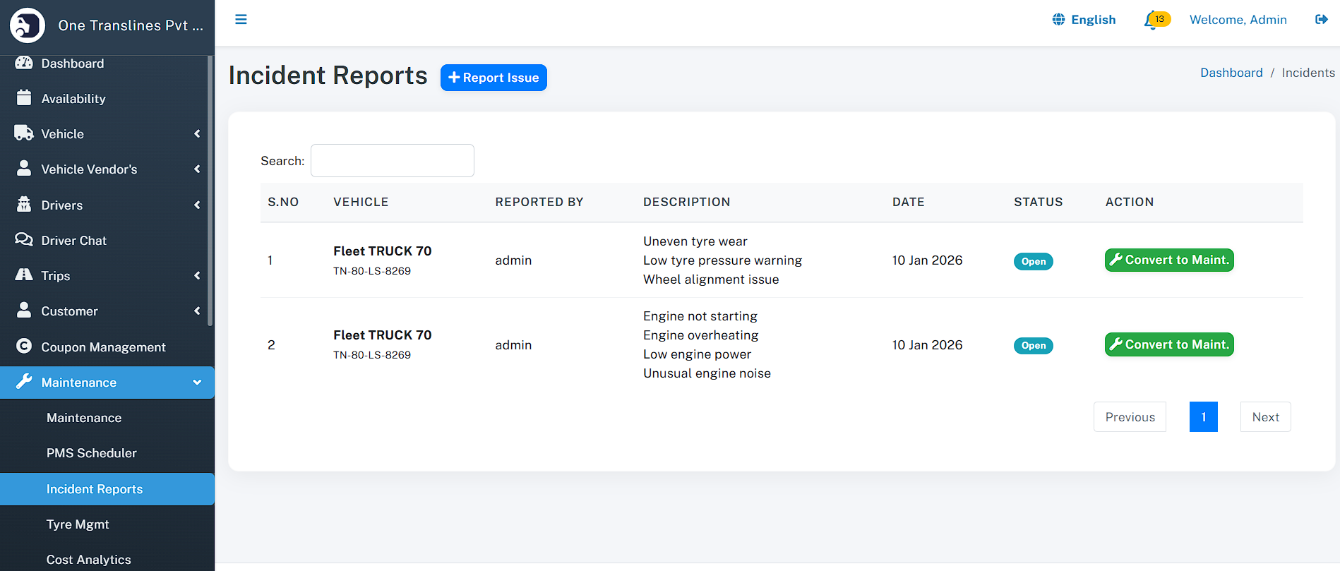 - Maintenance - Maintenance List - PMS Scheduler - Incident Reports - Tyre Management - Cost Analytics - Add Maintenance - Mechanic - Vendor