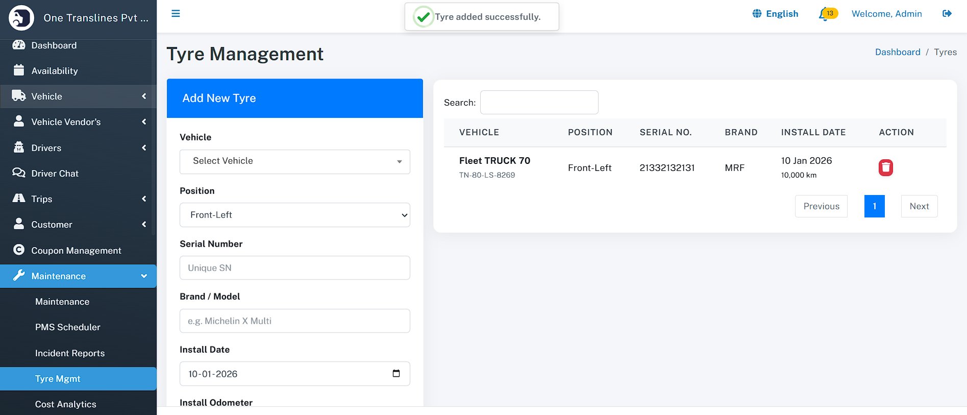 - Tyre Management: Complete lifecycle tracking for every tyre in your fleet.