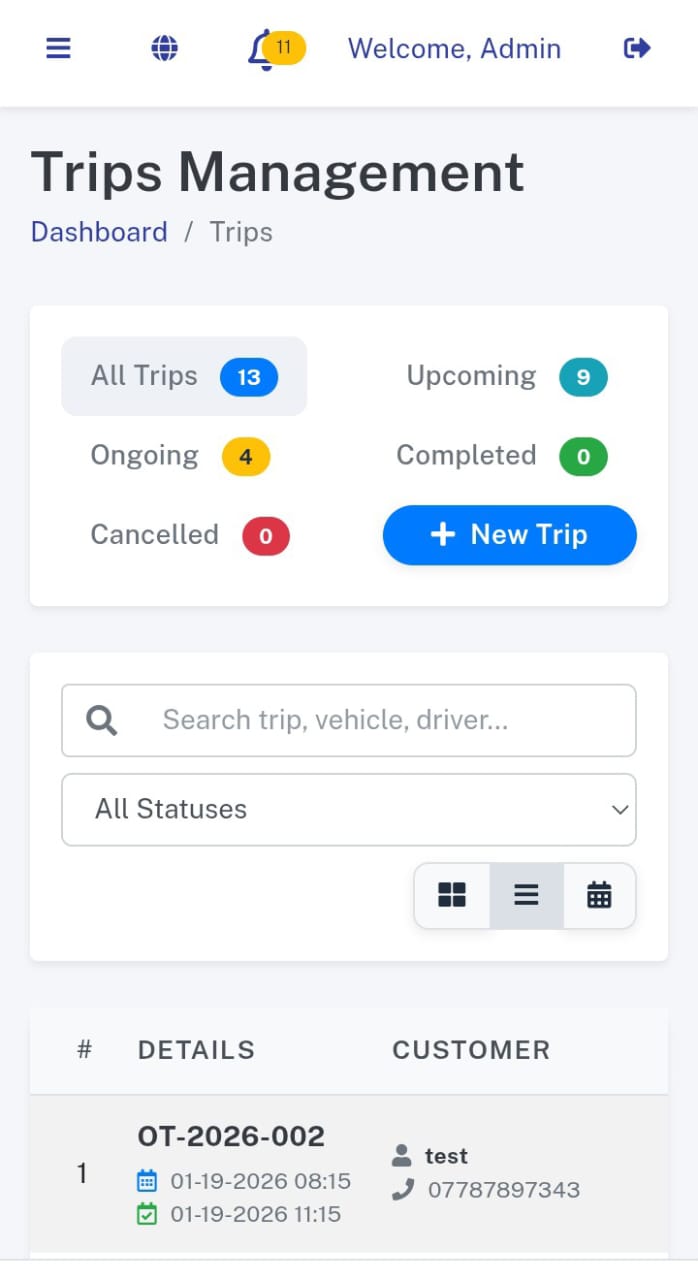 - Delayed Trips Alert: A dedicated warning grid highlighting trips that have exceeded their scheduled end time, including delay duration.