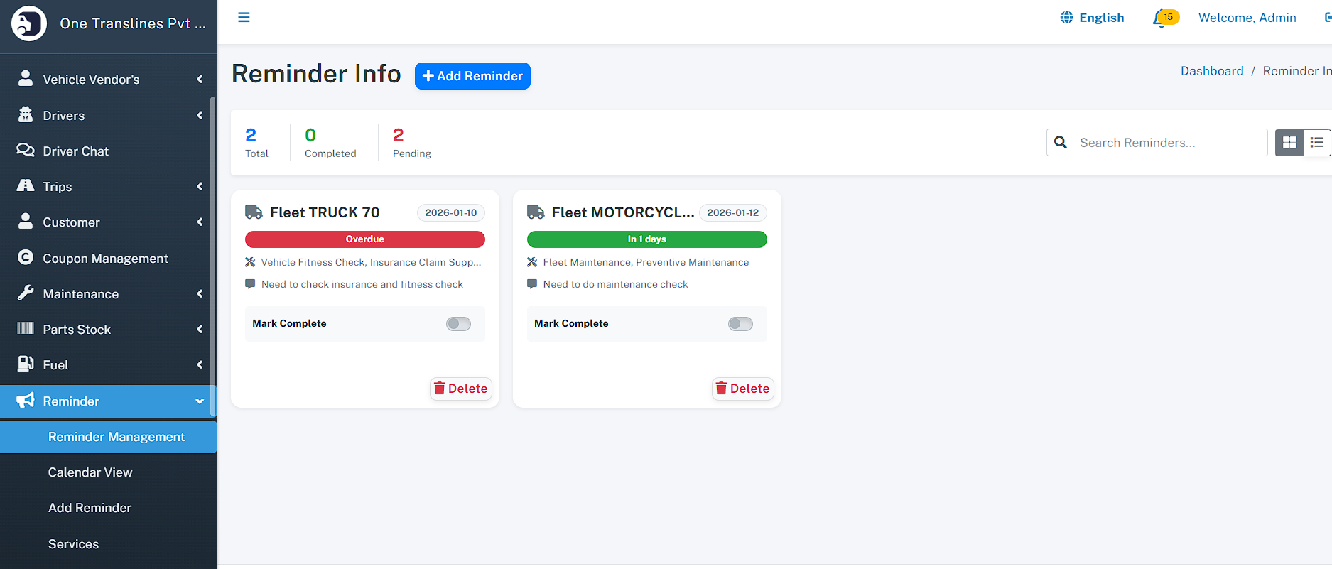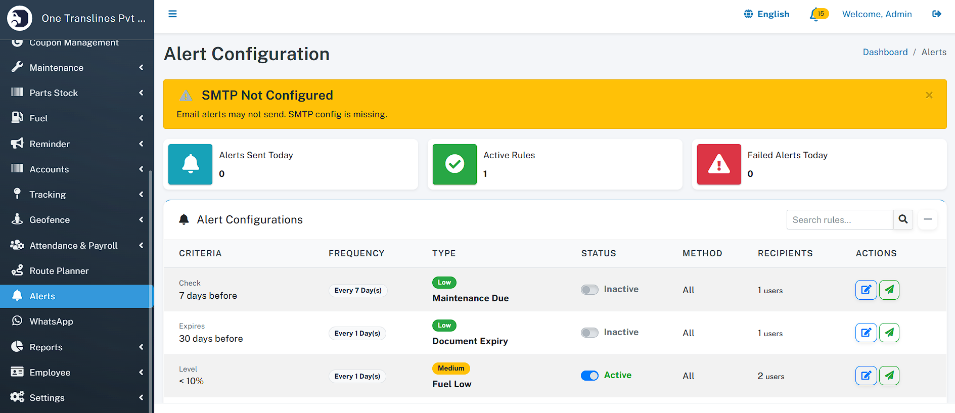 Stay compliant with automated reminders. The system notifies you days in advance for upcoming Insurance renewals, License expirations, and Maintenance schedules.