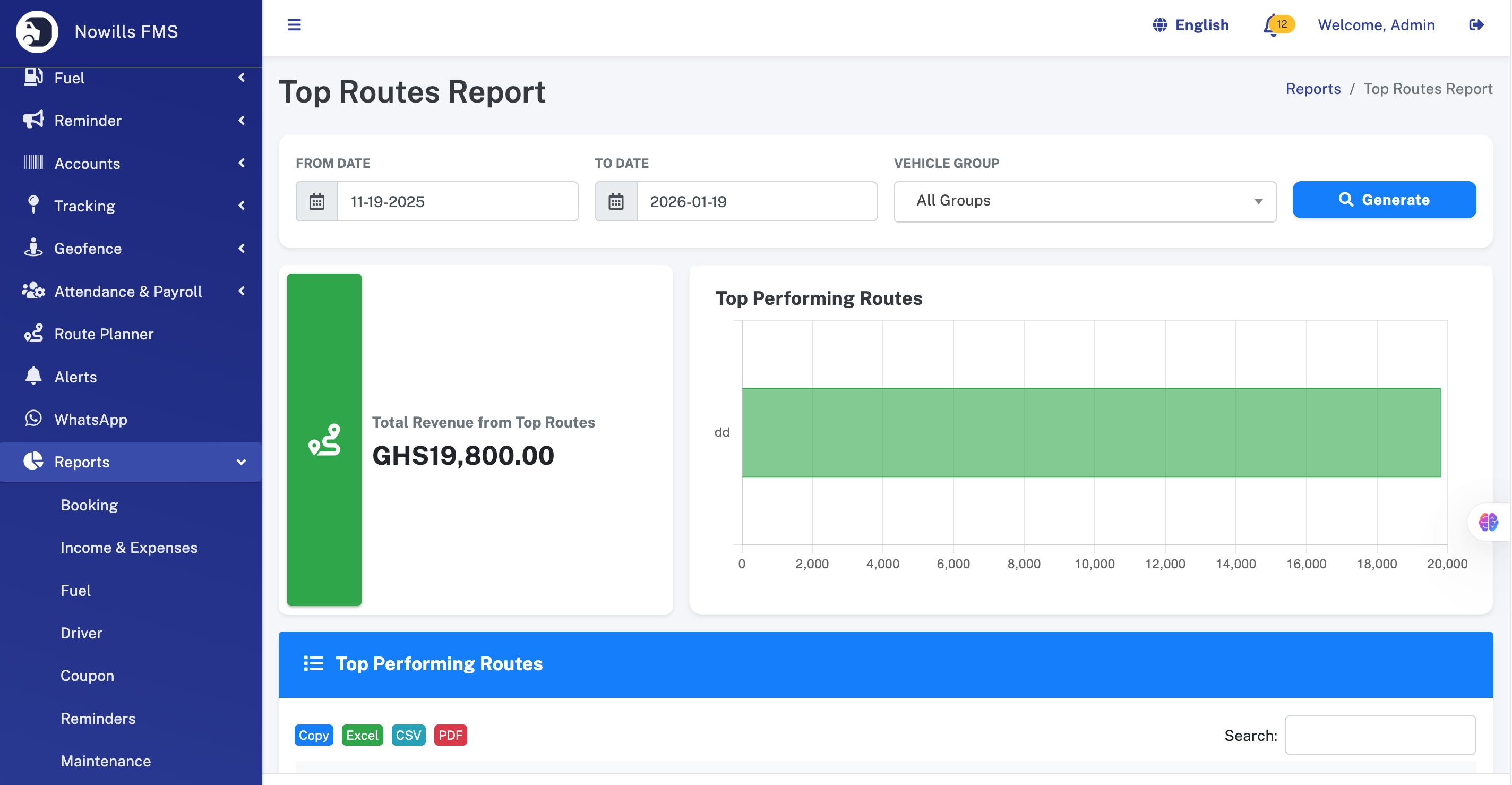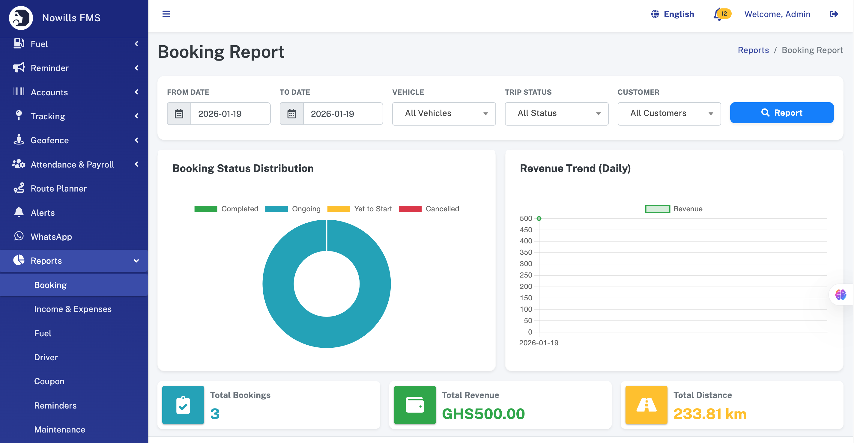 - Reports - Booking Report - Income & Expenses - Fuel Report - User Report - Coupon Report - Reminders Report - Maintenance Report - Top Income - Top Expense - Top Vehicles - Top Routes - Geofence Report - Profitability Report - Driver Performance
