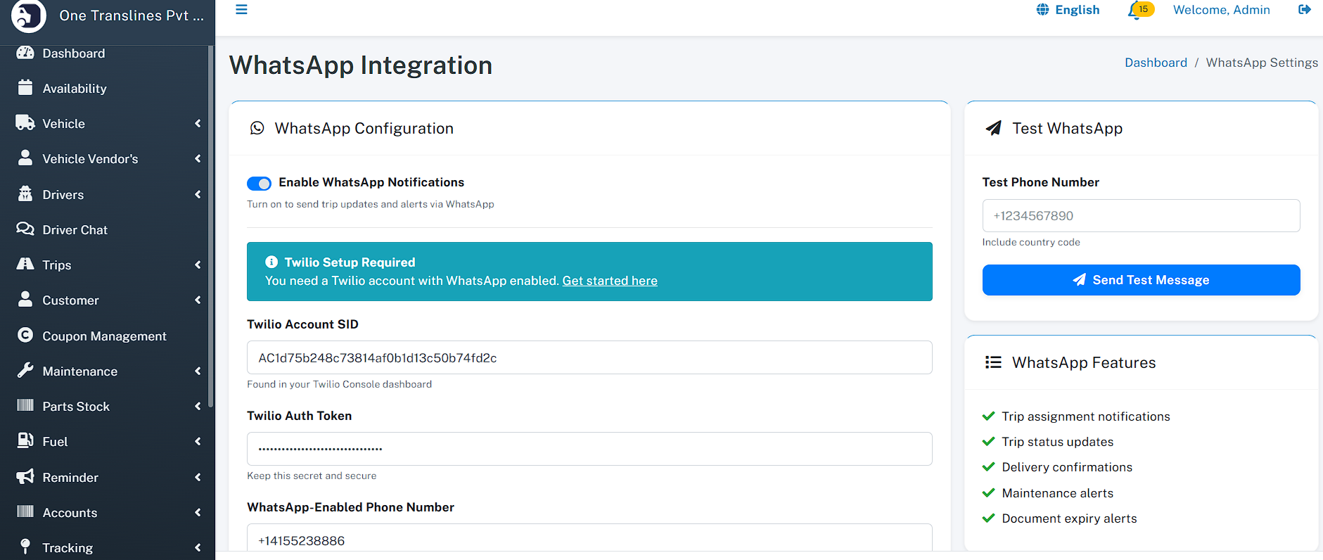 You can manage WhatsApp Configuration.
