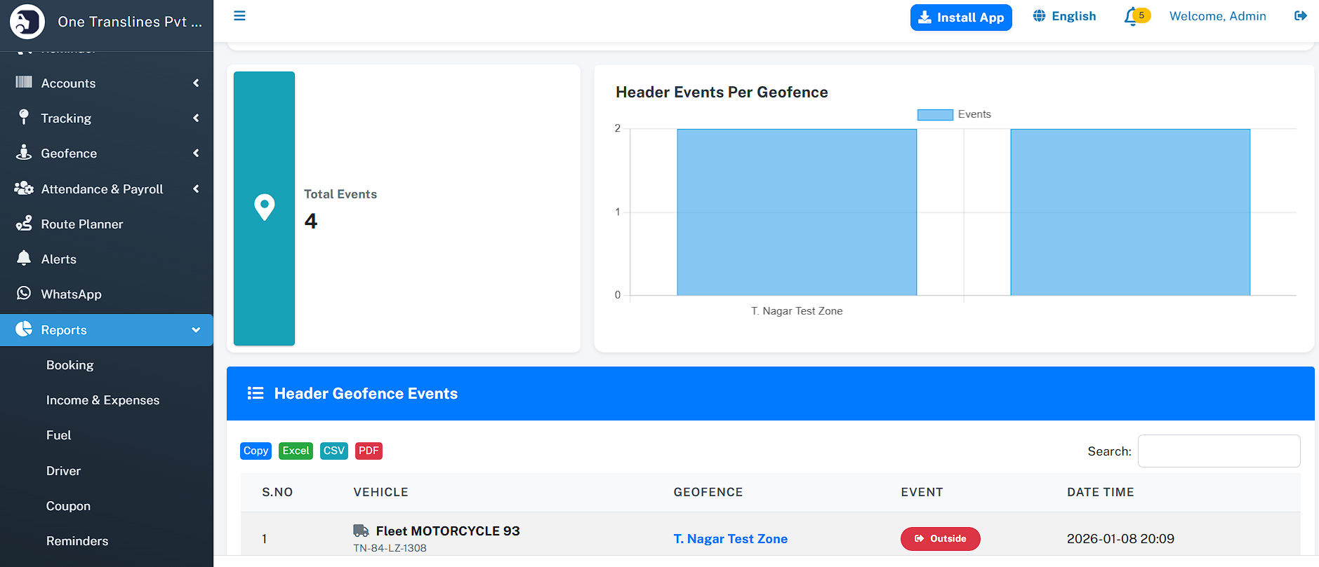 - Geofence Status: Real-time monitoring table showing which vehicles are currently inside specific geofences, with entry time and duration.